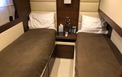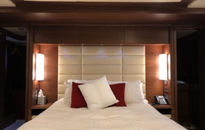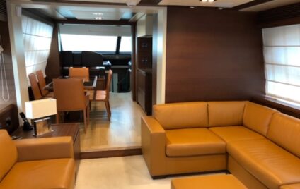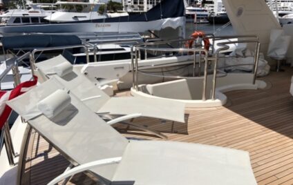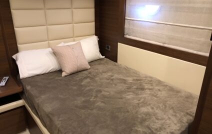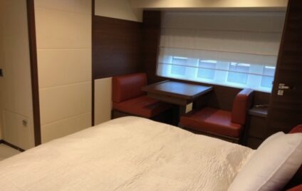 As you make your way to the main aft deck, she has alfresco dining for guests. Within the salon, you’re greeted with a contemporary finish and furniture and a formal dining table, seating for 6 guests. The master and VIP staterooms are en suite while the other 2 staterooms provide 2 twin beds each and separate day heads.