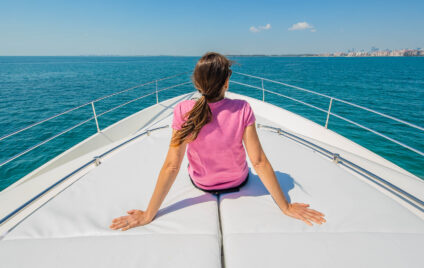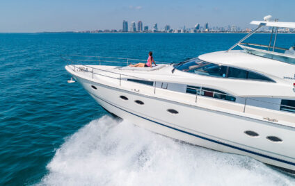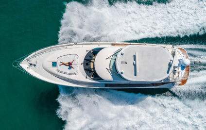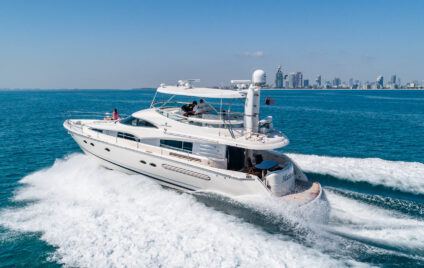 The Fairline was built in 2009. It is 64′ in overall length. It features a Master and VIP cabin with an en suite and a guest cabin with a day head. Fairline provides a small area in the cockpit for guests and within the saloon, there is more seating for your guests and a bar.