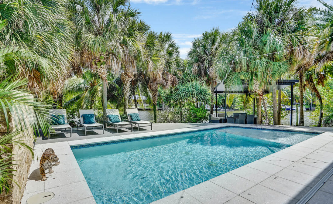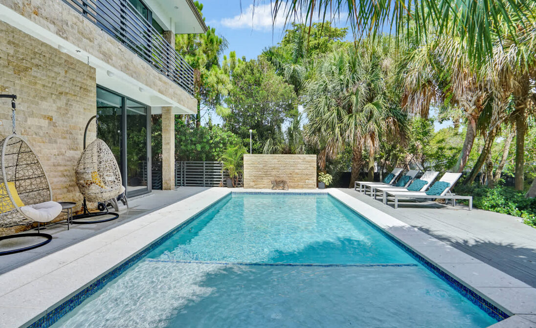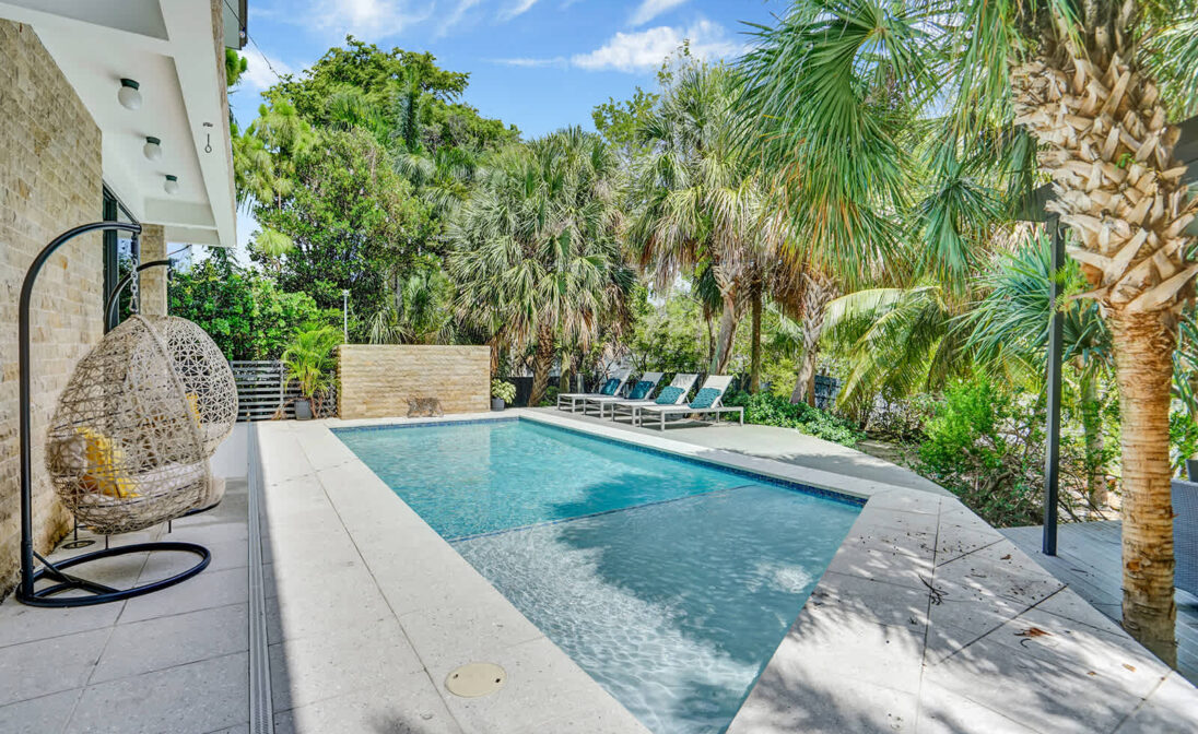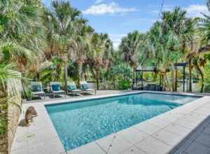 Pool: Full-size private pool with shallow lounging area, surrounded by lush landscaping and tropical vibes.