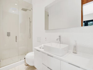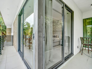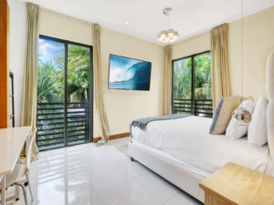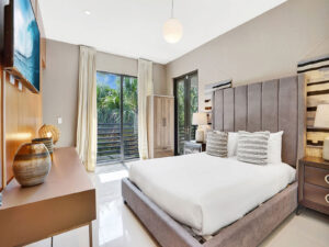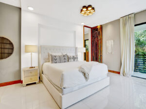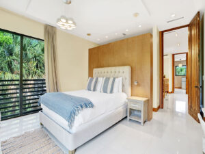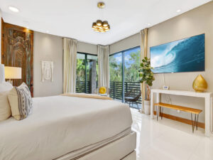 Guest Bedroom: 1 King Bed with ensuite bathroom featuring modern fixtures, walk-in shower, and designer finishes. This room also includes direct access to a private balcony, offering a quiet outdoor retreat on the ground floor.