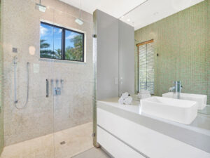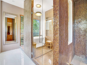 Guest Bedroom: 1 Queen Bed with ensuite bathroom, featuring custom tile work and built-in storage. This is the only upper-level bedroom without a balcony.