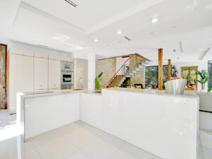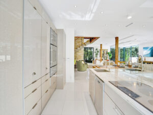 Kitchen: Kitchen: Modern European-style kitchen with custom high-gloss cabinetry, waterfall-edge island, dual sinks, and integrated appliances. Features include induction cooktop, double wall ovens, wine fridge, bar seating, and garden-view floor-to-ceiling windows.