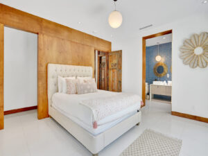 Guest Bedroom: 1 King Bed with ensuite bathroom, high ceilings, modern décor, and private balcony access.