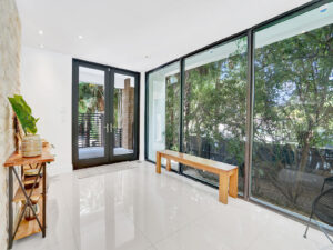 Living Room / Lounge Area: Spacious lounge with contemporary furniture, flat-screen TV, and expansive glass sliders leading to the pool deck. Perfect for relaxing or entertaining.