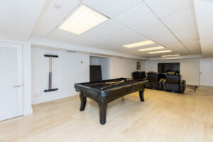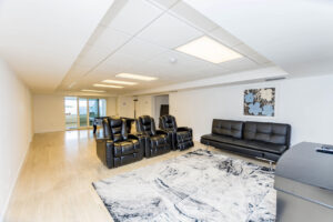 Game Room: An expansive entertainment lounge outfitted with a sectional sofa, large-screen TV, and game tables — perfect for movie nights or competitive fun.