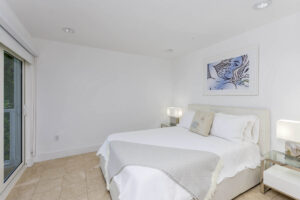 Guest Bedroom 4: Bright and inviting, this room features a queen-size bed, glass nightstands, modern art, and sliding doors leading to the outdoor area.