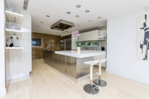 Kitchen: White marble countertops, sleek cabinetry, a large central island, and top-tier appliances. Perfectly situated for entertaining or intimate meals, with an open layout flowing into the living space.