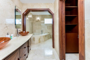 Junior Master: King-size bed, mirrored nightstands, and a private balcony overlooking the bay. En-suite bathroom features a walk-in shower, jacuzzi tub, dual vessel sinks, and a walk-in closet.