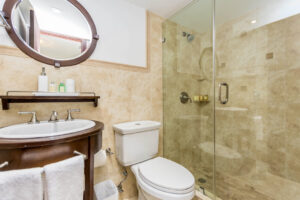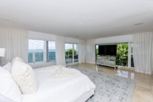 Master Bedroom: The master suite includes a king bed, private sitting area, reading nook custom walk-in closet, and floor-to-ceiling windows showcasing waterfront views. The en-suite bathroom offers a double vanity, rainfall shower, and freestanding soaking tub.